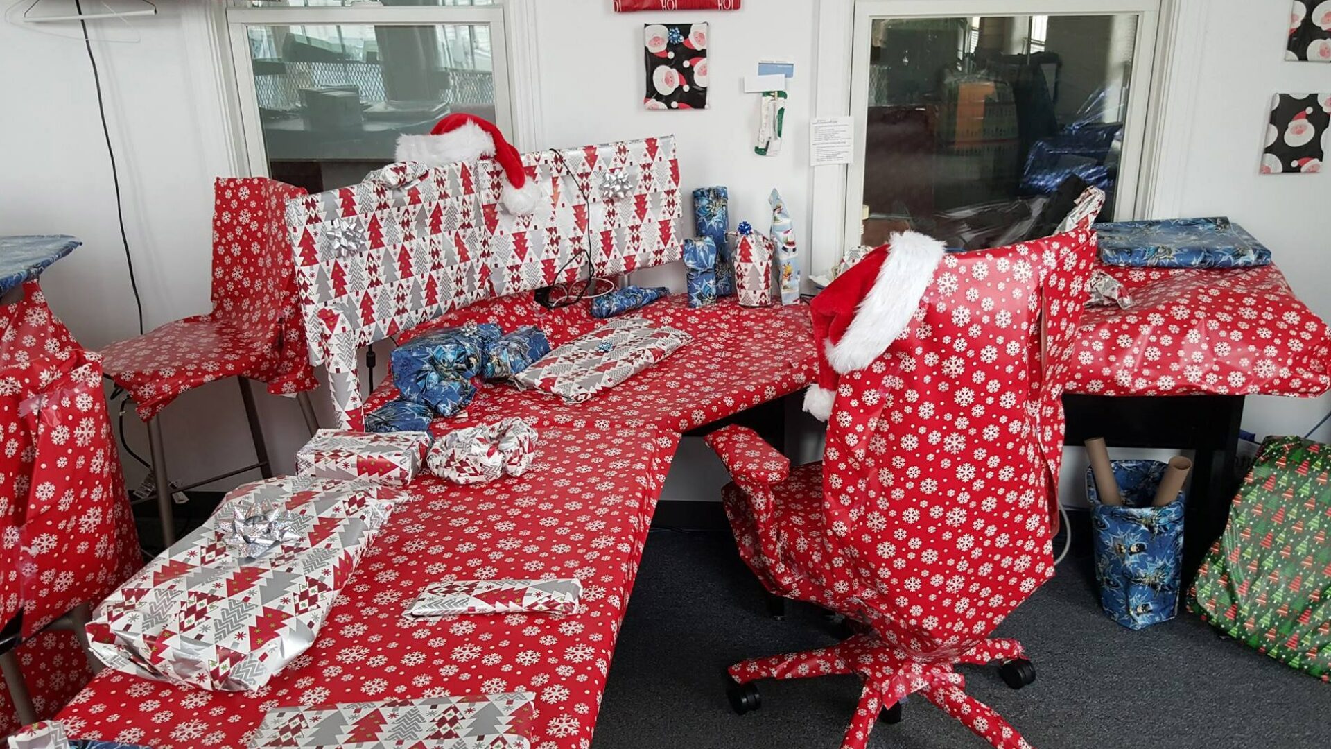 Last year, Envision's admin team turned our CEO's office into a giant gingerbread house. For this holiday season, they decided to "wrap up" the year by literally gift wrapping every thing in Todd's office, from his desk and computer to his office supplies to the furniture in his office to the pictures on his walls.